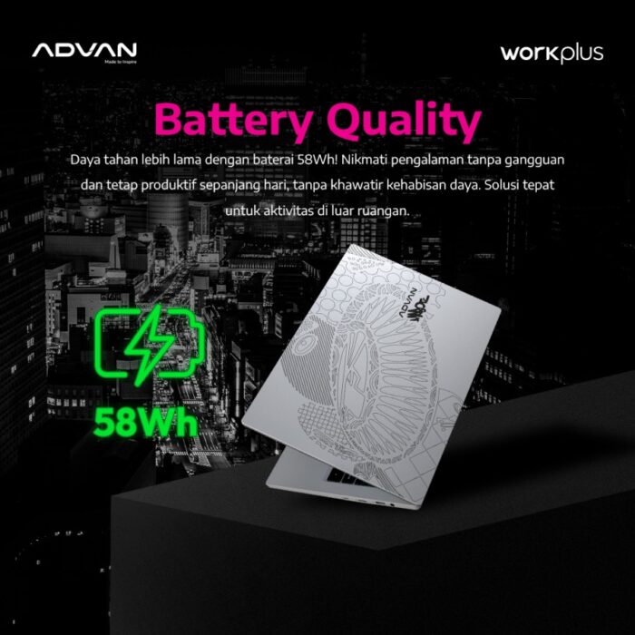 ADVAN menghadirkan mahakarya eksklusif terbaru, ADVAN WORKPLUS berkolaborasi dengan DARBOTZ. DARBOTZ adalah seorang seniman graffiti dan mural asal Indonesia, dikenal dengan gaya visual yang unik dan distinktif. Bersama dengan DARBOTZ, laptop WORKPLUS terbaru hadir dengan desain yang premium. Terdapat ukiran khas gaya Darbotz pada bagian bodi laptop, tampilan yang eksklusif dipadu dengan performance laptop yang maksimal akan memberikan pengalaman yang luar biasa bagi pengguna.