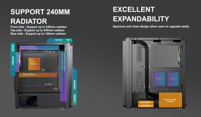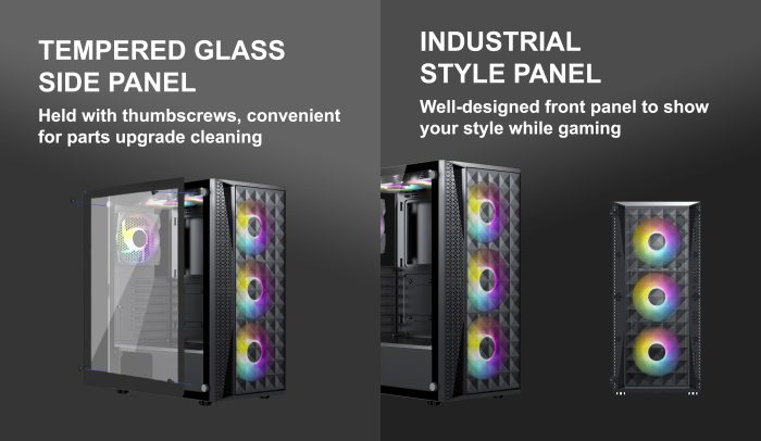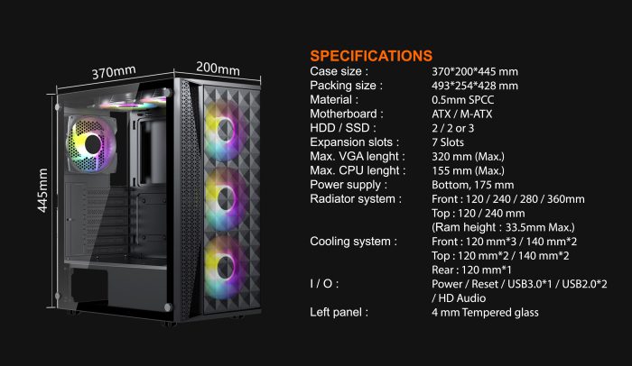Front Fans : 3x120mm Fixed RGB Fans(Included) / 2×140 mm