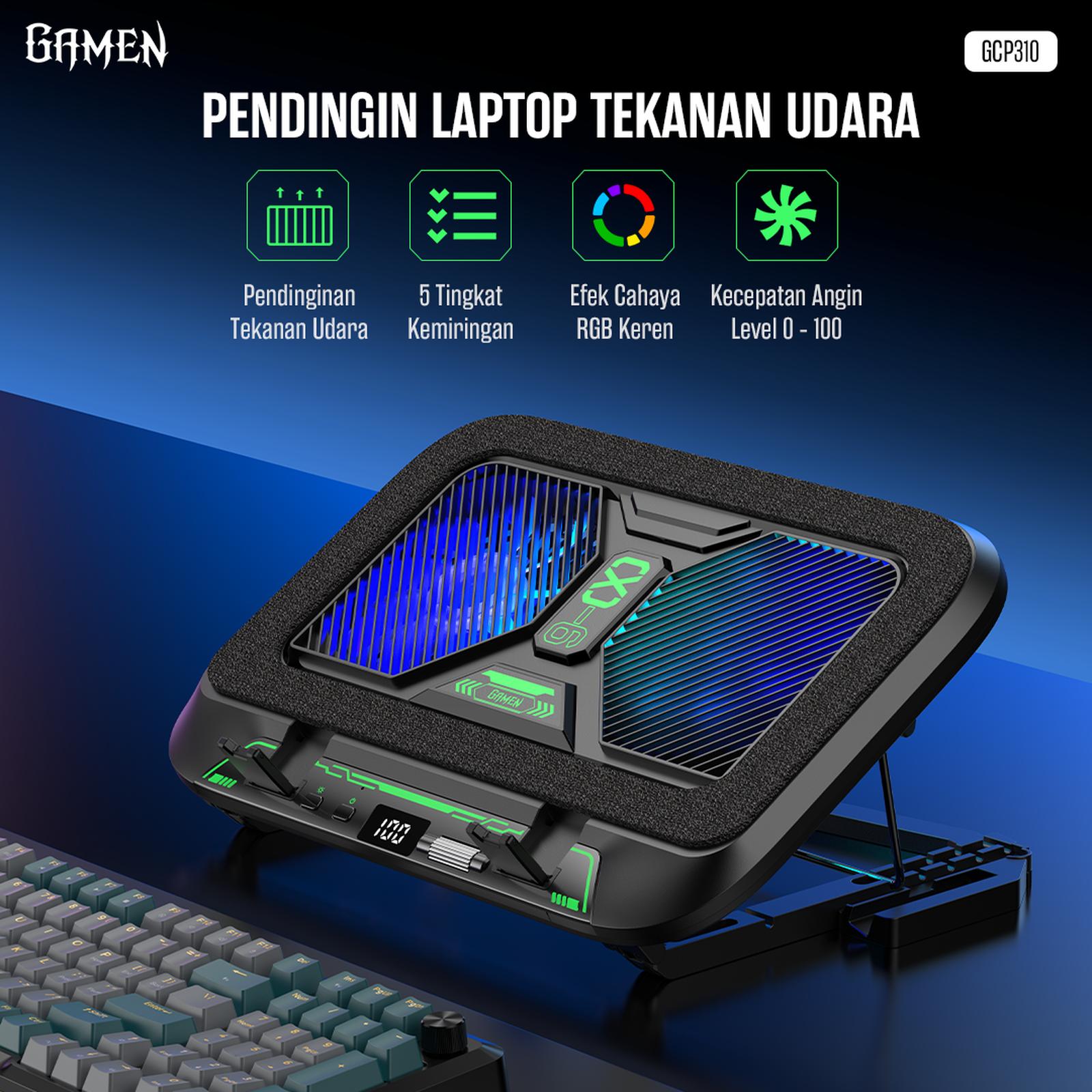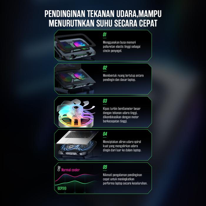 – Pendinginan Tekanan Udara Canggih : Menurunkan suhu laptop dengan cepat dengan kipas turbin berkecepatan tinggi