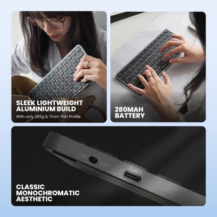 Rexus KL150 hadir dengan konstruksi aluminium elegan yang ringan dan kokoh. Dengan ketebalan hanya 7mm dan berat 265g, keyboard ini ideal untuk pengguna yang menginginkan mobilitas tinggi dan ringan tanpa mengorbankan kenyamanan dan durabilitas.