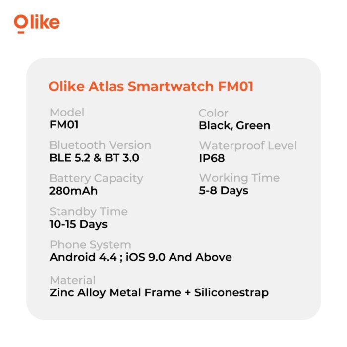 Smartwatch Olike Atlas FM01 Bluetooth IP68 Waterproof