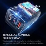 3. Menggunakan teknologi material GaN (Gallium Nitride) – semikonduktor generasi keempat terbaru yang mendukung kinerja charger agar dapat menahan suhu tinggi, lebih kuat serta mampu mengisi daya lebih cepat dan efisien.