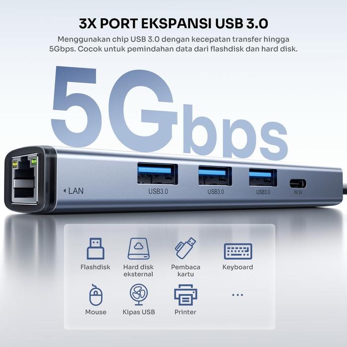 3. Dapat menghubungkan 5 perangkat sekaligus (3x USB 3.0, 1x RJ45, 1x Type-C).